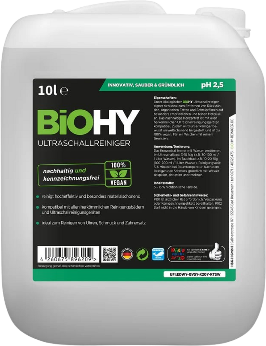 Ta ultrazvočni čistilec je primeren za vse ultrazvočne naprave in odstranjuje ostanke, organske maščobe, mazalne filme in druge usedline z nakita, ur, zobnih protez, kovancev, stekla, ur in še veliko več. Njegova formula za lesk brez vonja, ki topi maščobe, ni samo veganska in biološko razgradljiva, ampak tudi izjemno varčna.
