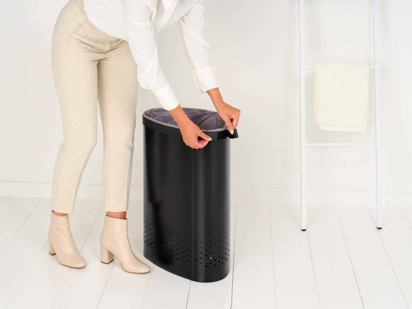 Dve škatli za perilo, ki potrebujeta prostor za eno - to je tisto, kar vam ponuja ta pameten in eleganten koš za perilo, ki ga ponuja znamka Brabantia. Odlična rešitev za zbiranje in ločevanje perila, to prinaša v vaš dom učinkovitost. Inovativna Quick-Drop odprtina vam omogoča, da vaše perilo dodate v koš. Vgrajena vreča za pranje perila z dvema predeloma je odstranljiva, zaradi česar je prevoz vašega perila otroška igra. Plastični pokrov skriva pogled na vsebino škatle, tako da se usklajeno združuje v vsako sobo.