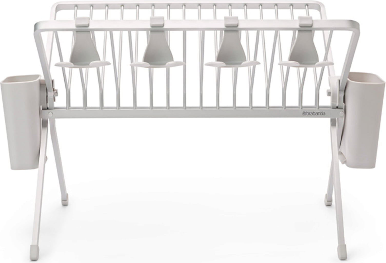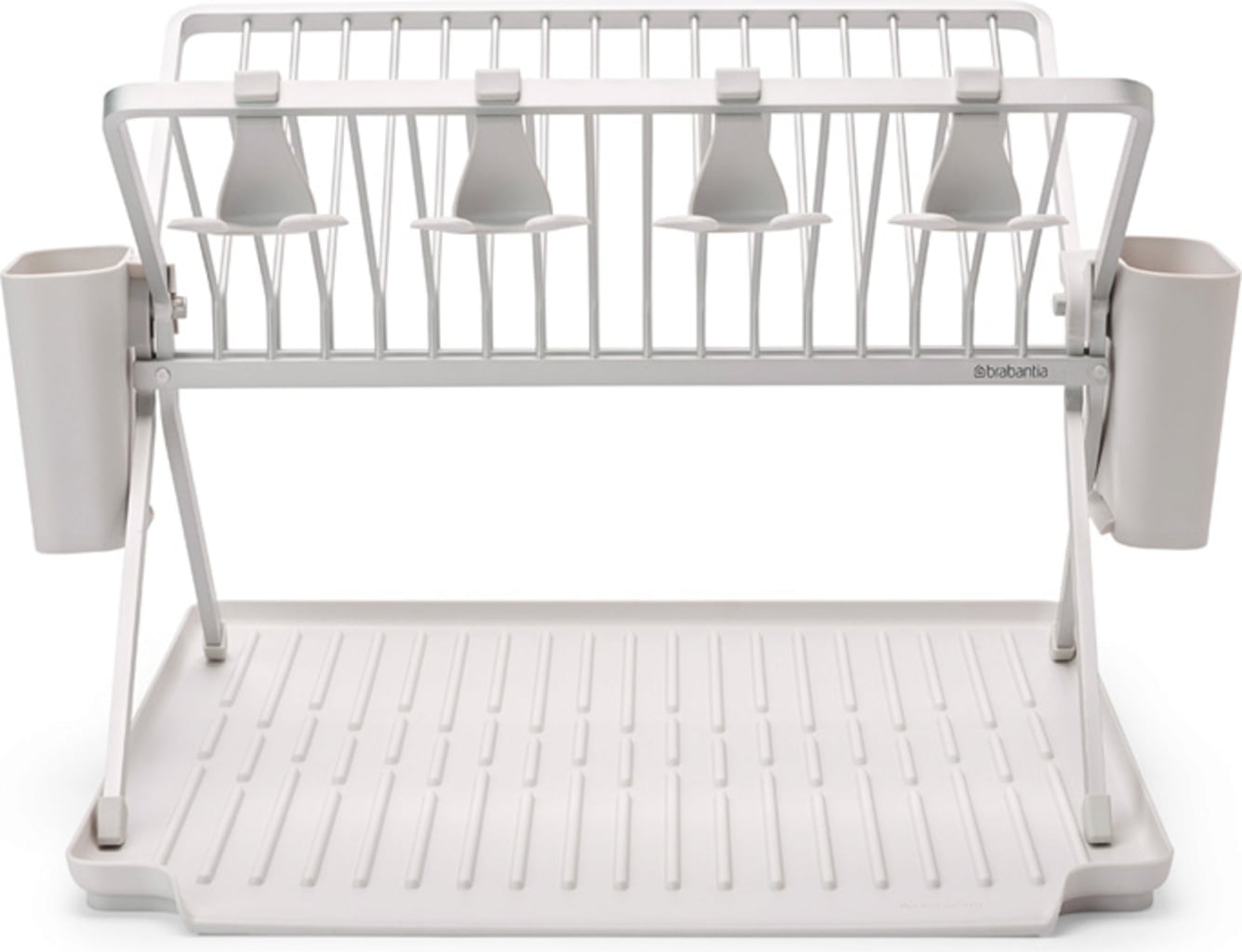 To odcejalno stojalo iz aluminija, ki vključuje žlebičasto plastično odcejalno posodo in dve odstranljivi košarici za pribor, je tako praktično kot vizualno privlačno – skoraj preveč lepo, da bi ga zložili. Kljub temu ga lahko v trenutku zložite in kompaktno pospravite. Nudi prostor za do 17 krožnikov, prav tako pa omogoča priročno shranjevanje loncev, ponev in kozarcev. Kozarce lahko varno obesite na štiri praktične kavlje.