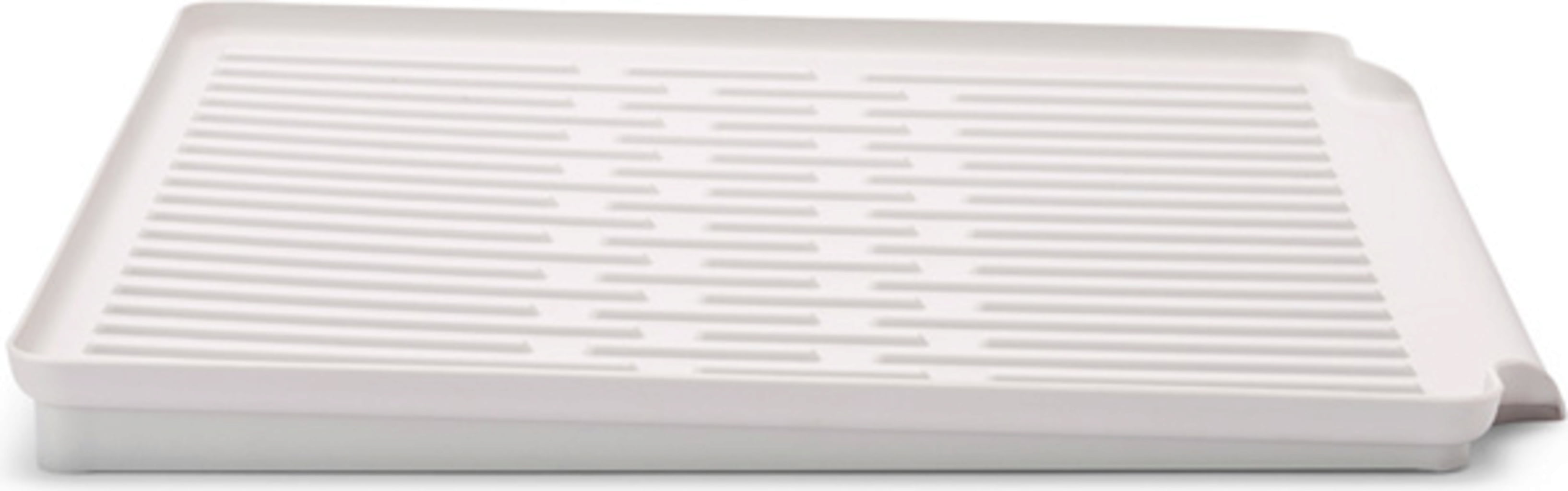 Priložena odcejalna posoda se lahko uporablja skupaj s stojalom ali ločeno. Zaradi rahlega naklona z odtočno odprtino učinkovito usmerja ostanke vode neposredno v pomivalno korito, njeni utori pa omogočajo optimalno prezračevanje in hitro sušenje.