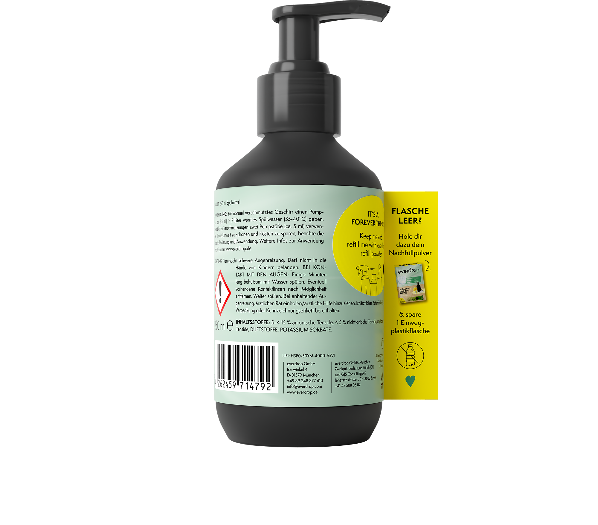 Praktična plastenka s pumpico je namenjena ponovnemu polnjenju, tako da, ko porabite detergent, lahko z vodo in inovativnim Detergent za posodo v prahu, v vrečki znamke everdrop povsem preprosto zmešate nov detergent za pomivanje posode!