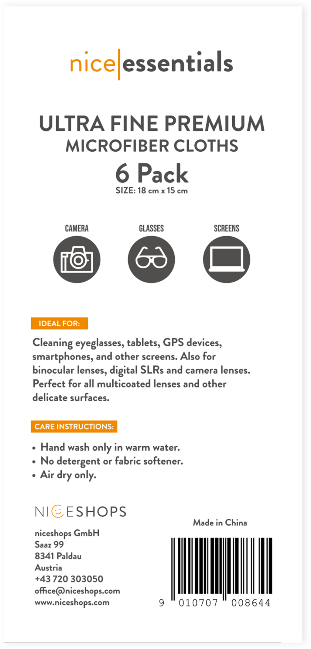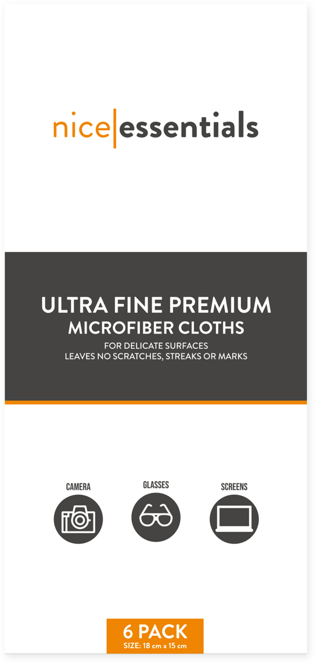 Ultra fine krpe za čiščenje iz mikrovlaken znamke nice essentials so idealne za temeljito, a nežno čiščenje občutljivih površin, kot so očala, zasloni ali objektivi fotoaparatov. Visokokakovosten, gosto tkan material iz mikrovlaken zanesljivo privlači prah, umazanijo in olje ter odstranjuje nadležne prstne odtise – ne da bi pustil praske ali vlakna.